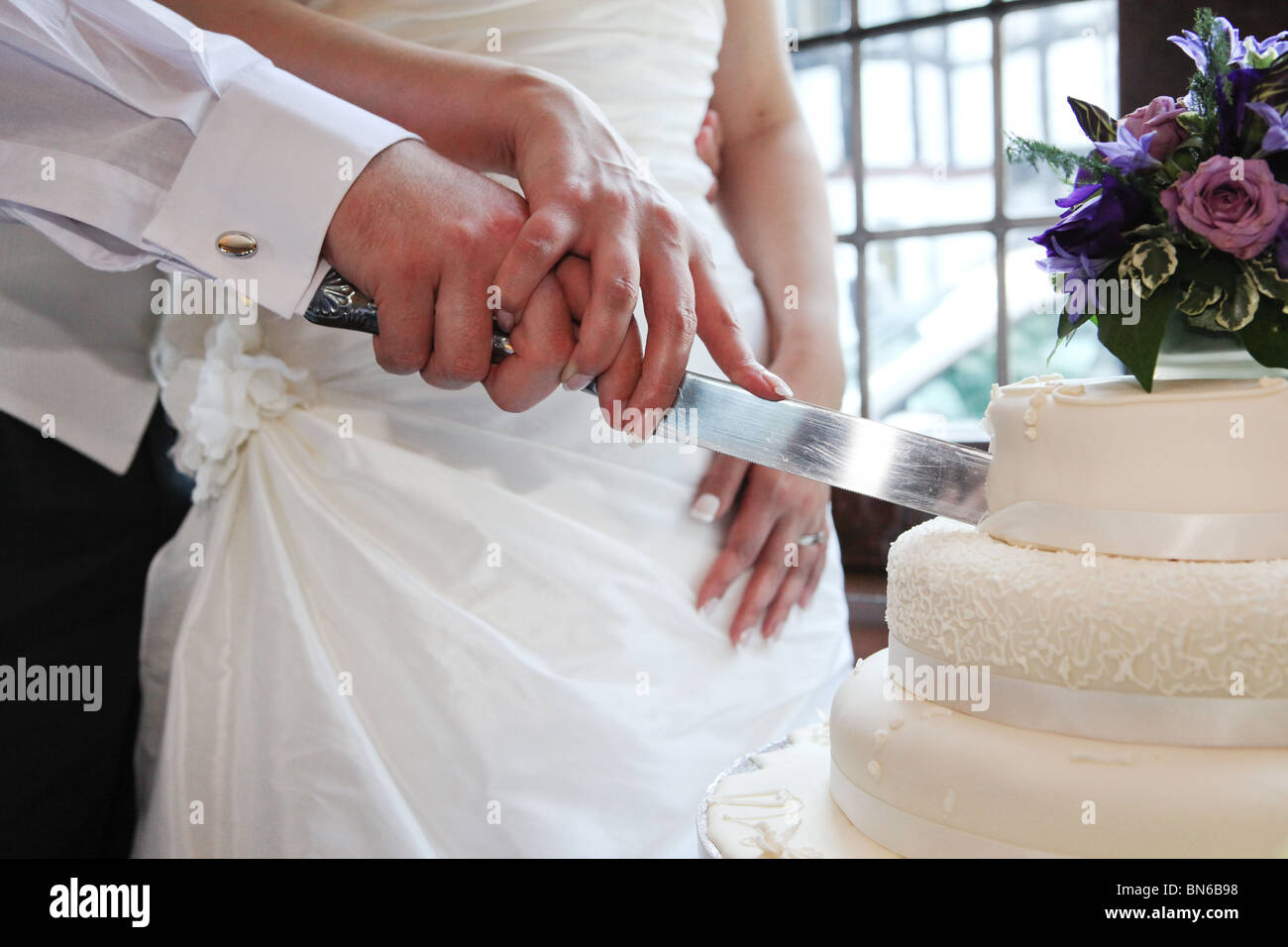 Bride And Groom Holding Couteau Et Couper Le Gateau De Mariage A