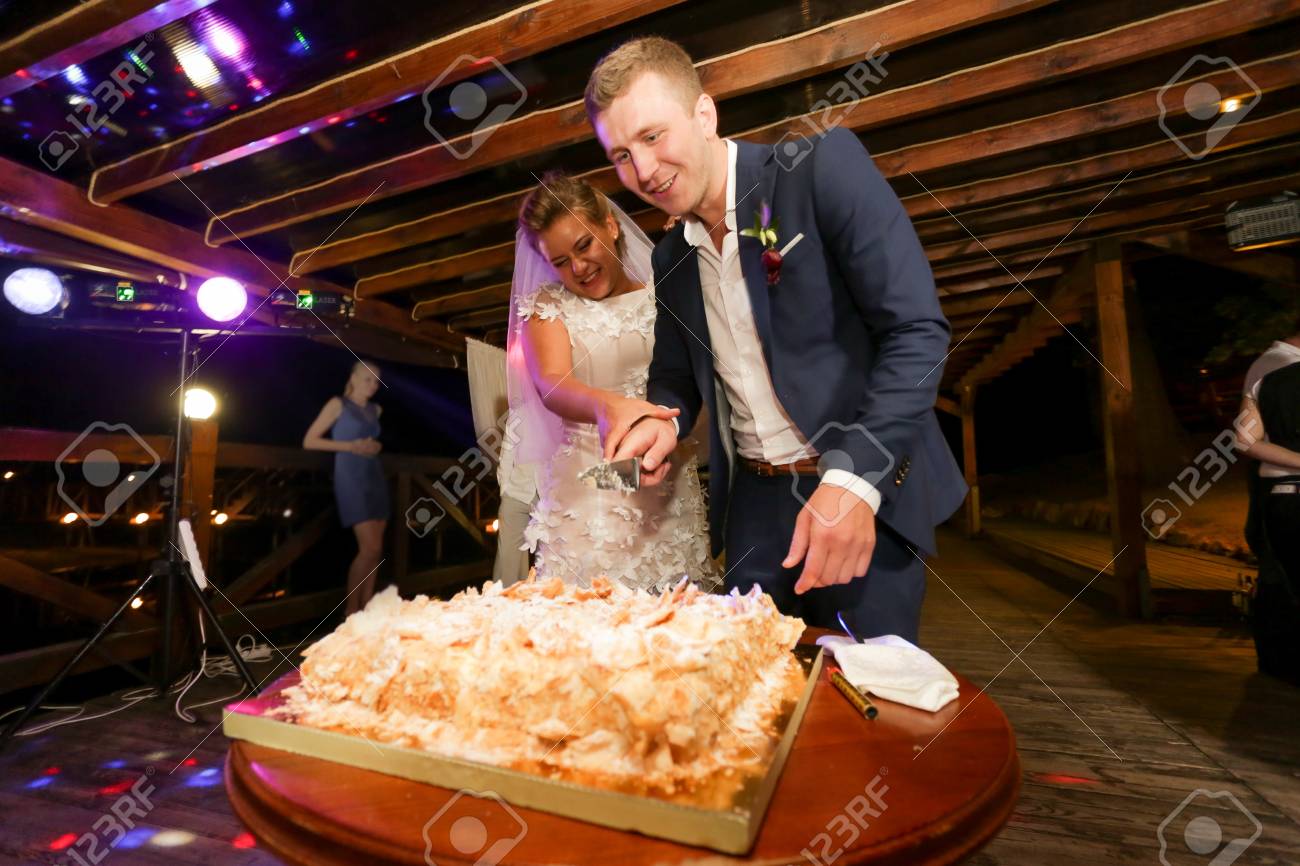 La Jeune Mariee Et Un Marie Coupe Leur Gateau De Mariage Image