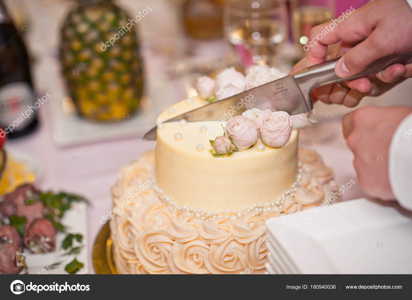 Coupe Garcon Beau Gateau De Mariage A L Aide D Un Couteau Banque D