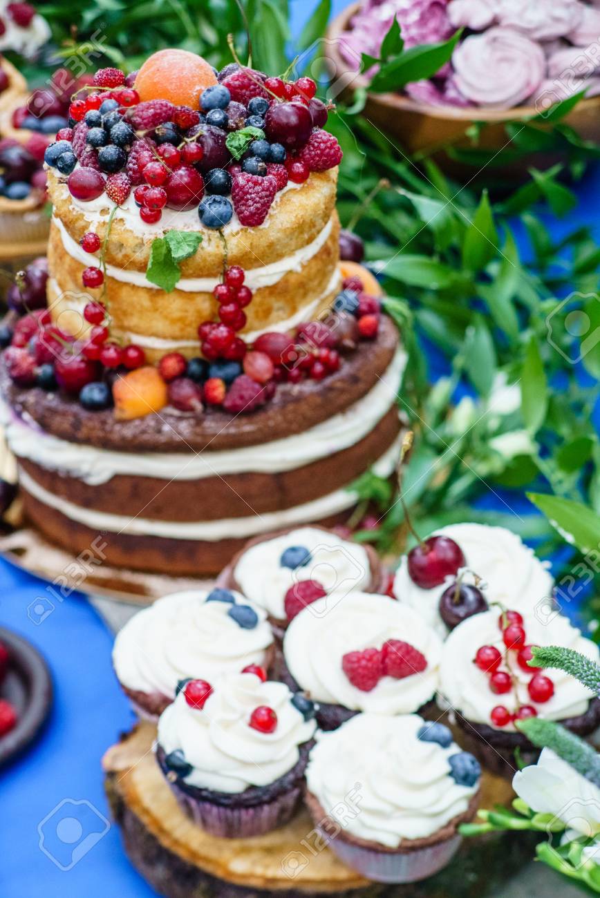 Gateau De Mariage Nu Decore De Baies Et De Fleurs Banque D Images