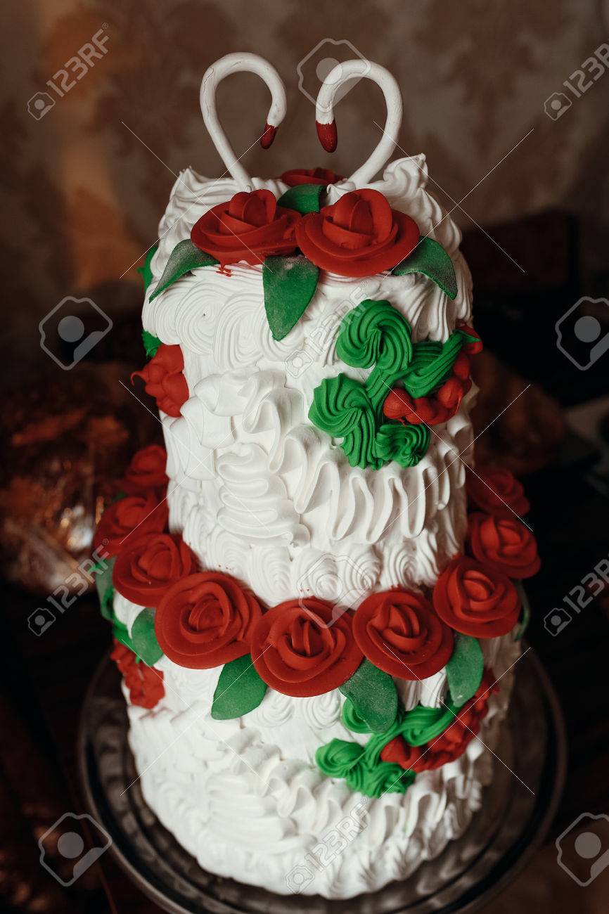 Beau Gateau Avec Des Cigognes Sur Le Dessus Orne De Roses Rouges