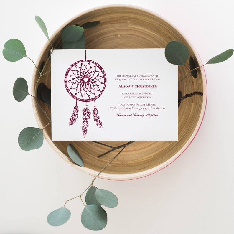 Burgundy Bohemian Feather Editable Wedding Invitation Etsy
